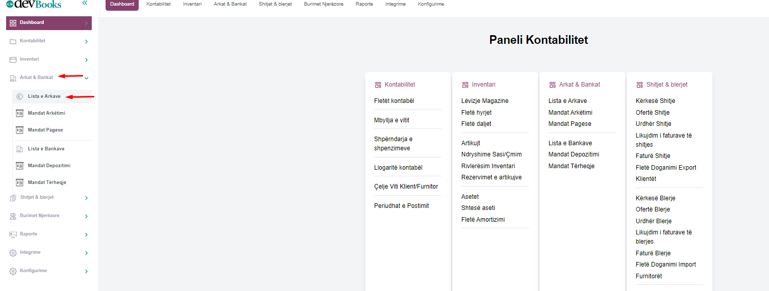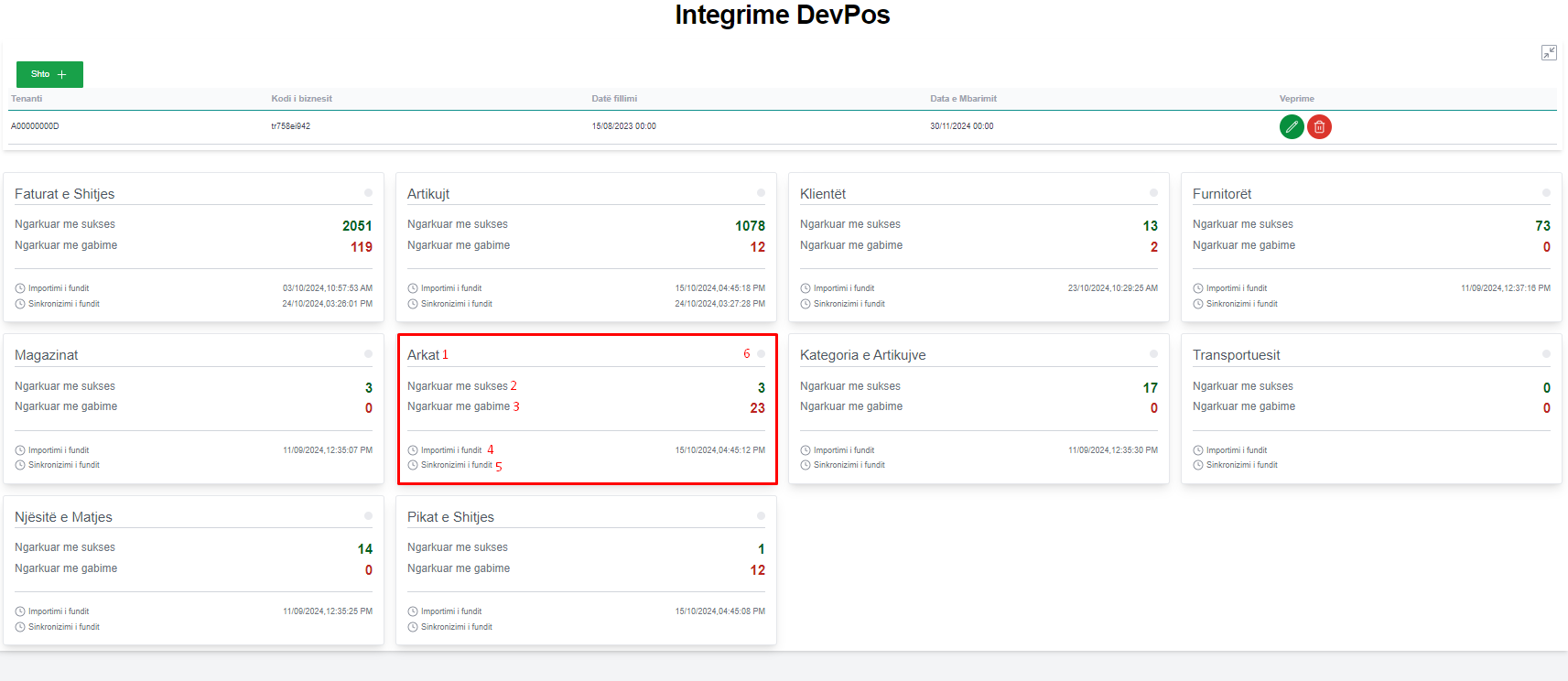 - Sinkronizimi i fundit --> tregon daten e fundit qe eshte kryer sinkronizimi i te dhenave nga paneli DevPos te DevBooks drejt seksionit "Lista e arkave" te sistemit DevBooks.