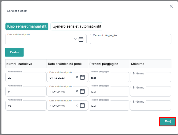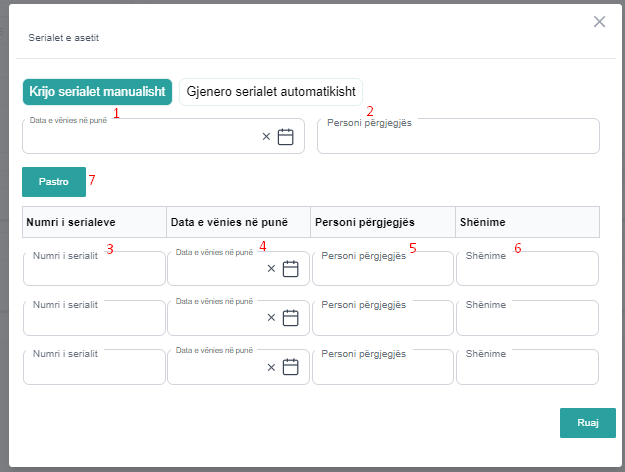 Pasi plotesohen keto fusha, automatikisht mbushin me informacion daten e venies ne pune(4) dhe personin pergjegjes(5) te serialeve te asetit.