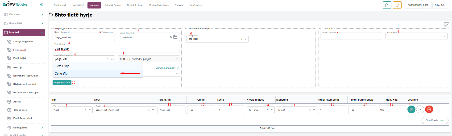 Per te regjistruar celjen e aseteve duhet te navigoni tek Inventari dhe me pas klikoni Flete Hyrje.