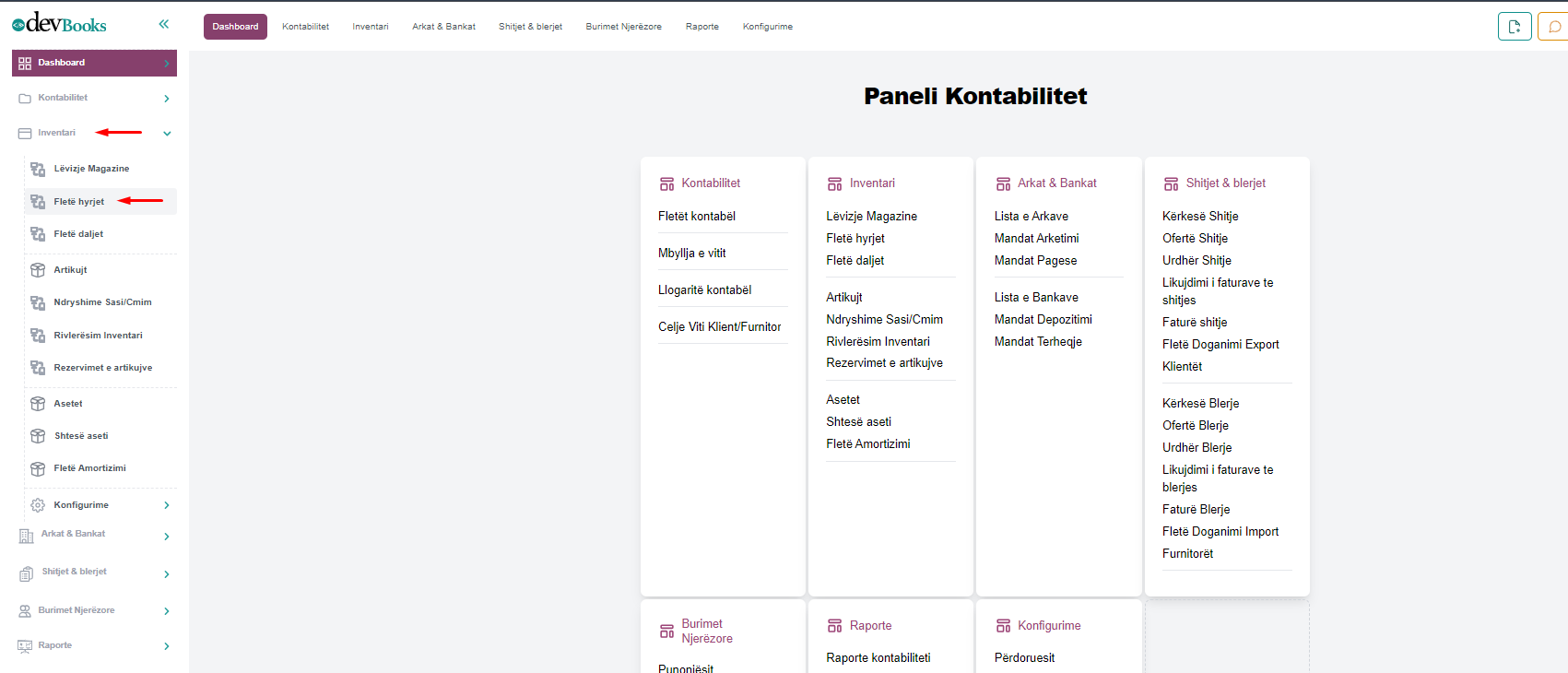 Per te regjistruar celjen e aseteve duhet te navigoni tek Inventari dhe me pas klikoni Flete Hyrje.