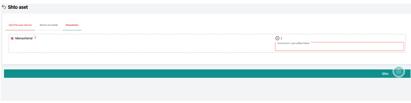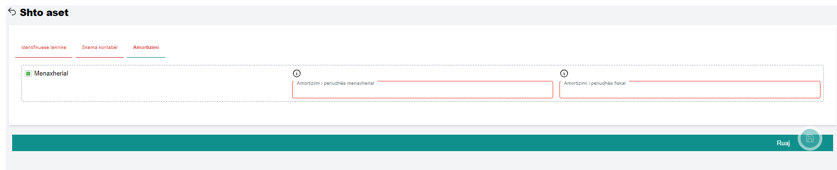 - Nese aseti do te ndiqet dhe ne menyre manaxheriale klikohet butoni kuq dhe aktivizohet duke shfaqur dhe fushen per te vendosur vleren ne % per amoritizimin manaxherial sic paraqitet me poshte.