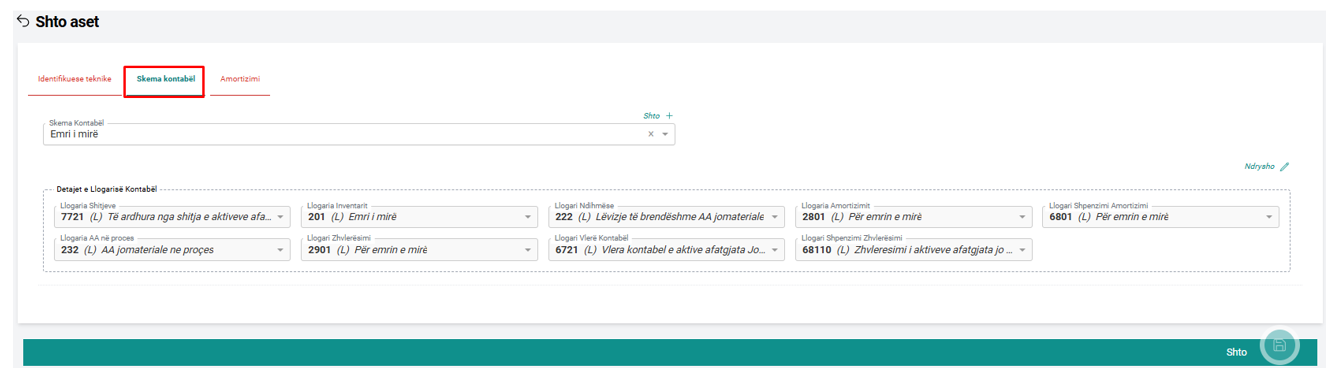 Pasi të keni plotësuar të gjitha fushat e nevojshme në tab-in Të përgjithshme , klikoni tab-in Skema Kontabël (fig x)