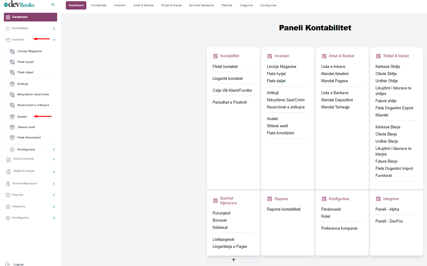 Për të shtuar një aset të ri klikoni në menunë inventari, përzgjidhni dhe klikoni nën menunë Asetet.