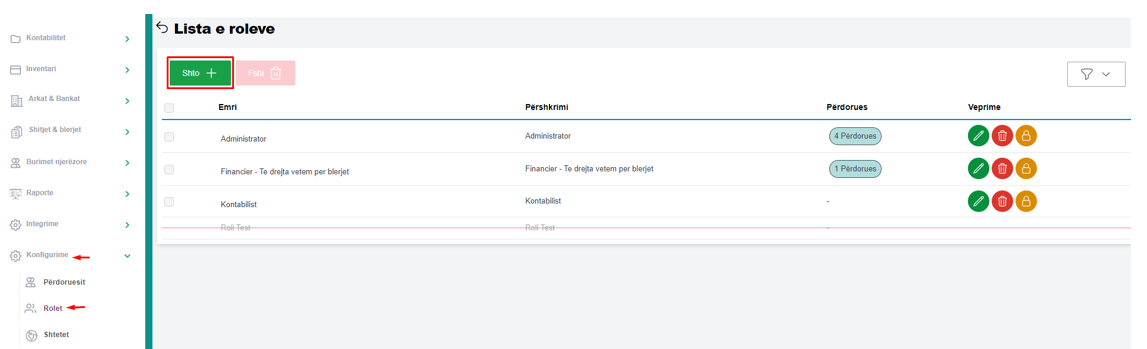 Për të kryer shtimin e roleve duhet të klikoni në menunë Konfigurime, më pas klikoni nënmenunë Rolet (fig 6). Në ekran do t’ju shfaqet lista me të gjitha rolet e shtuar në sistem. Për të shtuar një rol të ri klikoni në butonin Shto (fig 7).