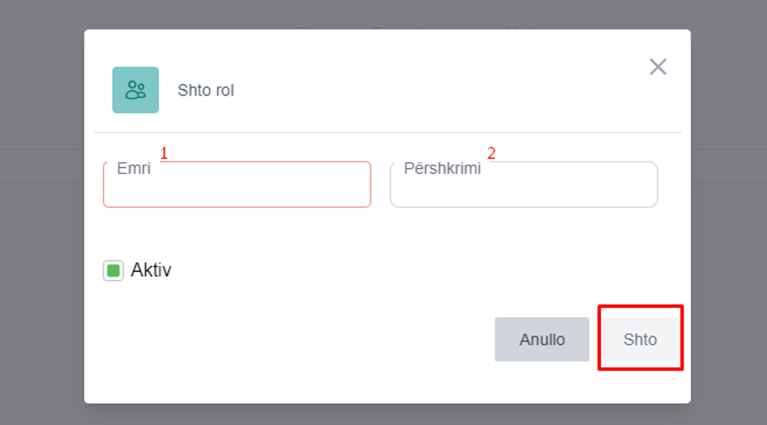 Në dritaren e shfaqur plotësoni fushat Emri (1) dhe Përshkrimi (2). Pasi janë plotesuar fushat klikoni butonin Shto. Roli i ri do të shtohet me sukses (fig 7).