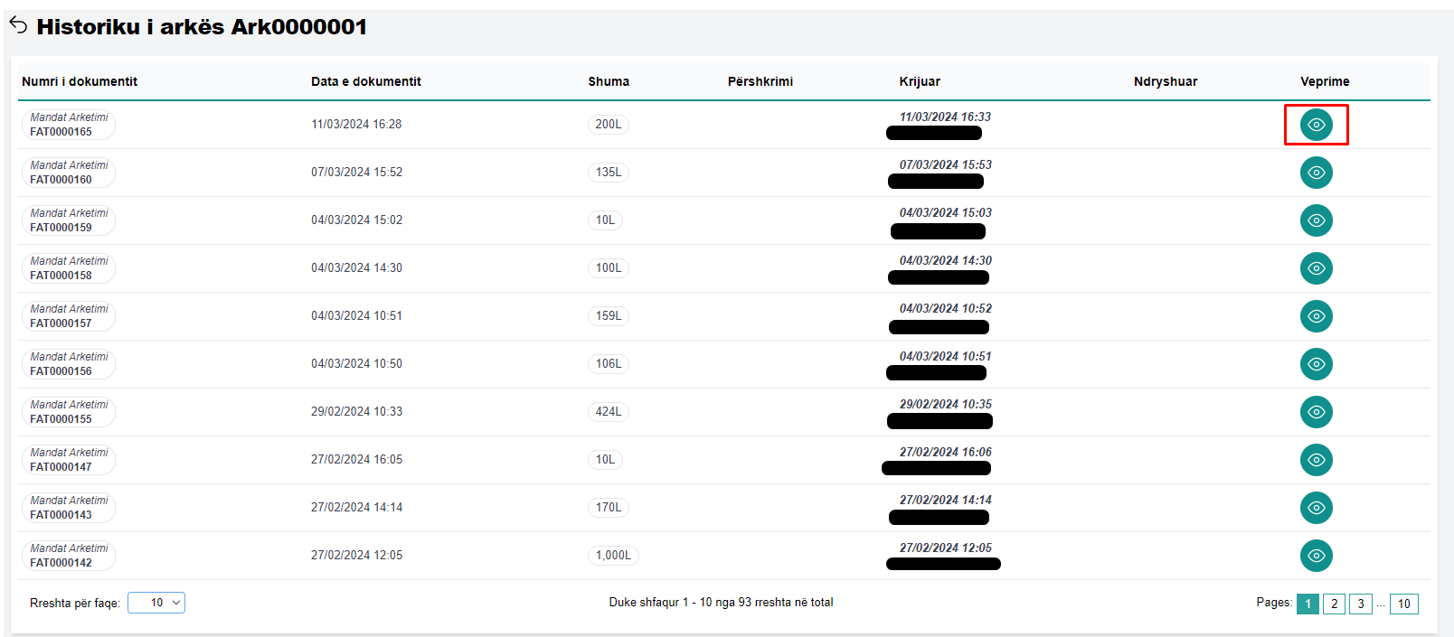 Për të kontrolluar historikun e veprimeve në arkat e regjistruara në sistem klikoni butonin Shiko historikun e veprimeve (fig 1.1(2)). Pasi të klikoni në butonin Shiko historikun e veprimeve do t'ju shfaqet historiku i arkës ku përmban informacion në lidhje me numrin e dokumentit, datën e dokumentit, shumën, përshkrimin, datën e krijimit dhe emrin e përdoruesit që e ka krijuar. Ne butonin Veprime do mund të shikoni detajet e arkëtimit. (fig 4.1)