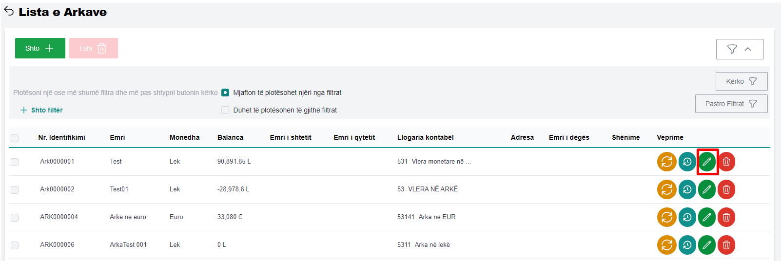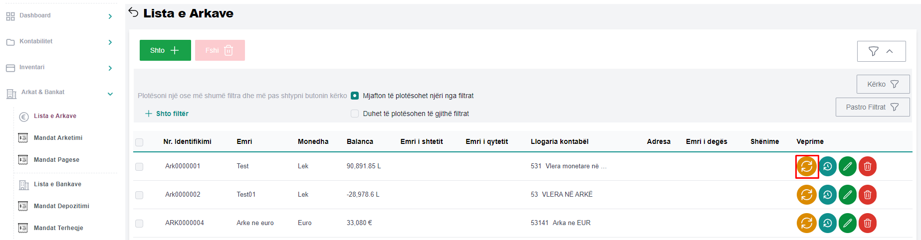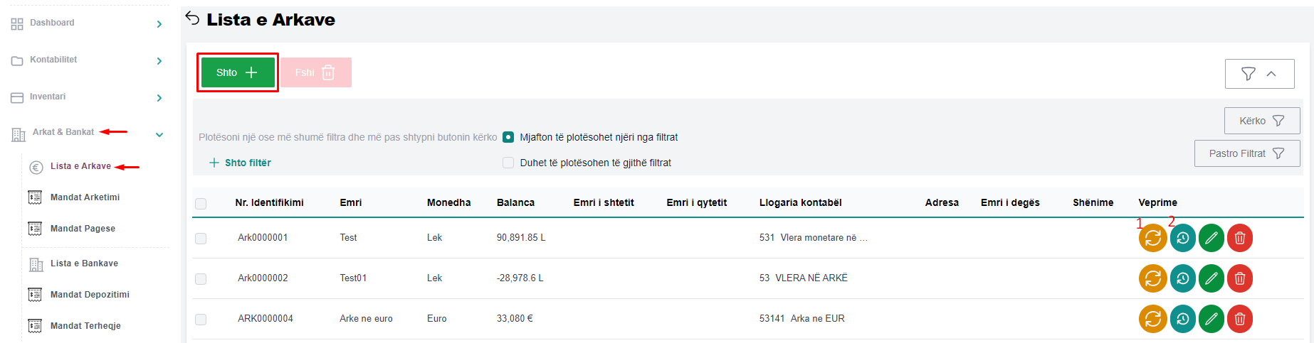 Në menunë lista e arkave mund të shtoni arka, të sinkronizoni balancën në arkë, të kontrolloni historikun e veprimeve në arkë, modifikoni të dhënat e një arke dhe të fshini arkën nga sistemi