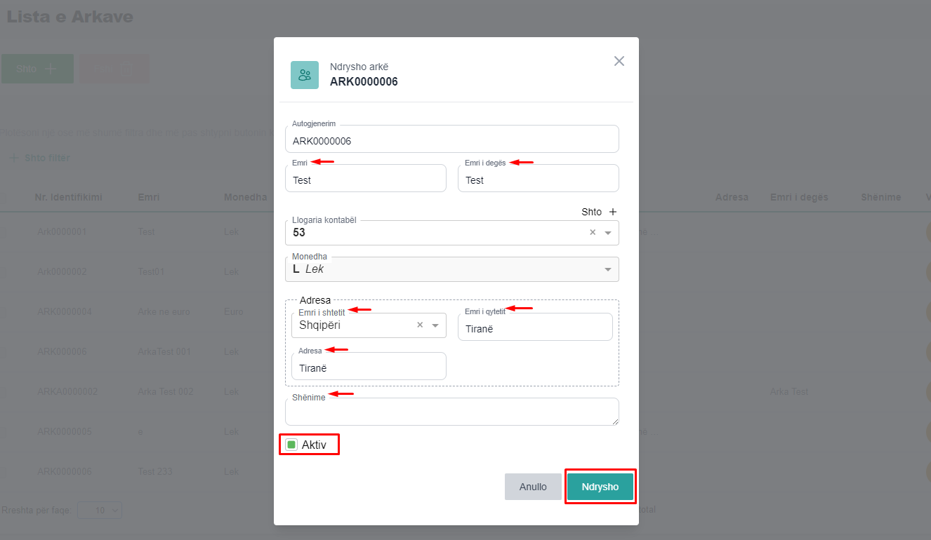 Pasi të keni klikuar butoni Ndrysho arkën do mund të editoni të dhënat Emri, Emri i degës, Emri i shtetit, Emri i qytetit, Adresa, Shënime dhe të ktheni një arkë aktive në inaktive duke klikuar mbi opsinin Aktiv. Pasi të keni modifikuar të dhënat klikoni ne butonin Ndrysho (fig 2.2) për të ruajtur ndryshimet me sukses.