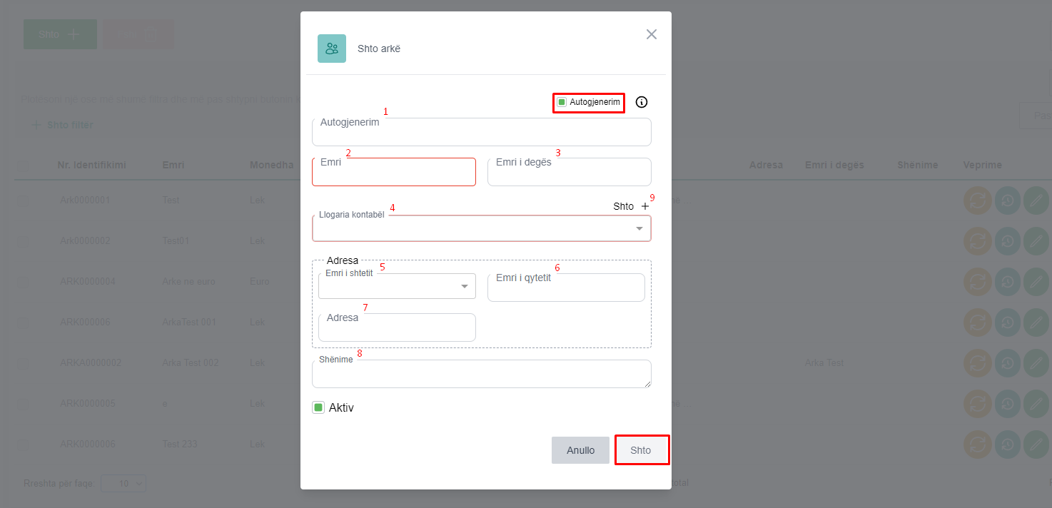 - Emri (2) - Plotësoni emrin e arkës, fusha emri është e detyrueshme.