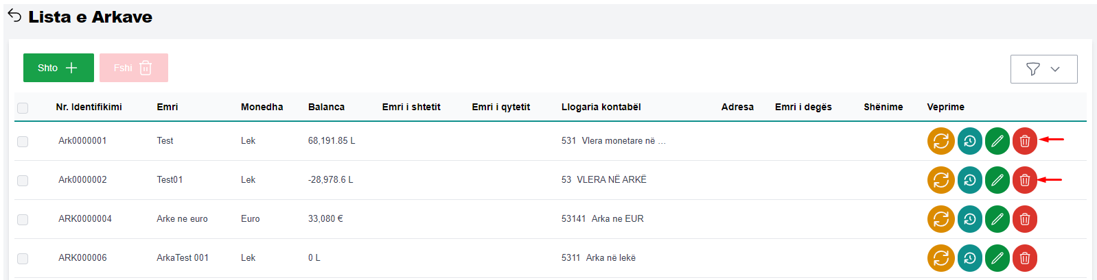Për të fshirë një arkë nga sistemi klikoni në butonin Fshi arkën (fig 5.1). Pasi të klikoni butonin Fshi arkën klikoni butonin Fshi në popup-in e konfirmimit për të konfirmuar fshirjen e arkës.