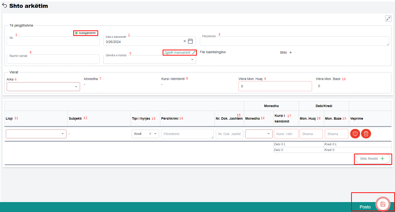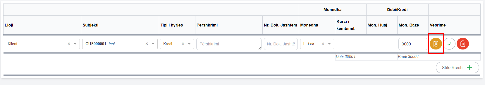 15.Monedhë e huaj - Në rastet kur monedha është e ndyshme nga lekë, vlera e debit/kreditit do të plotësohet në fushën Mon.Huaj