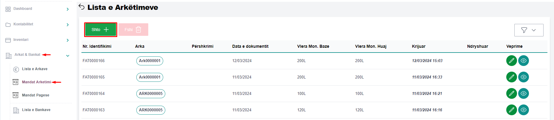 Për të shtuar një mandat arkëtimi klikoni në menunë Arkat & Bankat, përzgjidhni nënmenunë Mandat Arkëtimi dhe klikoni në butonin Shto (fig 1.1).