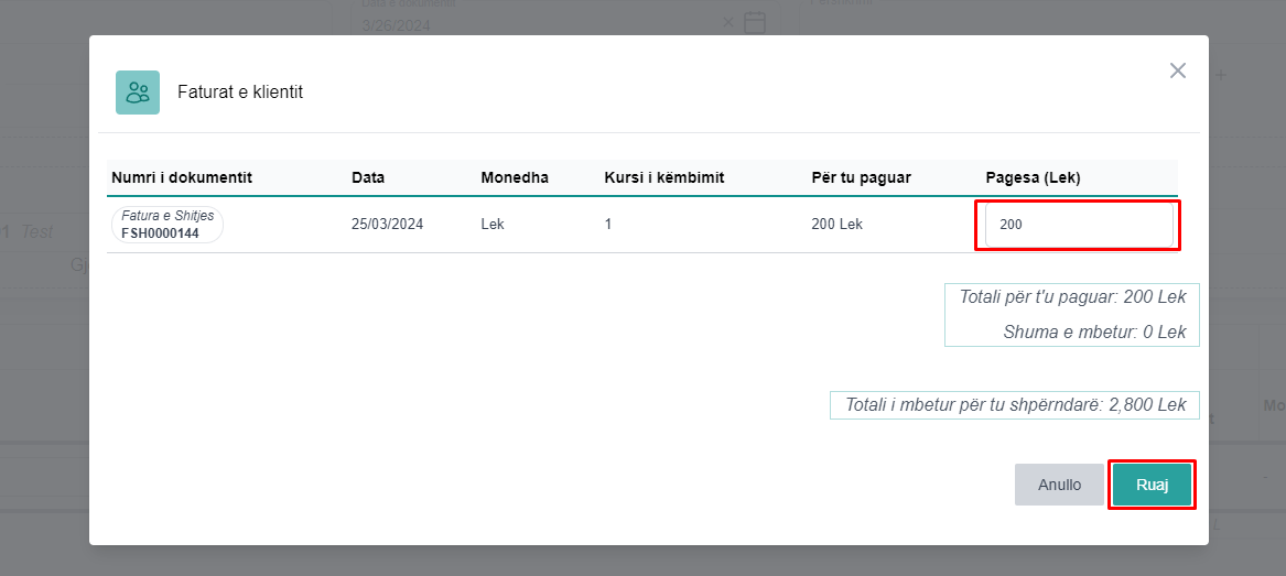 Duke klikuar në butonin paguaj faturat do mund të shihni të gjithë faturat e papaguara nga klienti dhe të paguani ato brenda vlerës së mandatit që do të regjistroni. Për të paguar faturat mjaftonë të përzgjidhni faturat që do të paguani të plotësoni vlerën në fushën Pagesa dhe të klikoni në butonin Ruaj (fig 1.4).