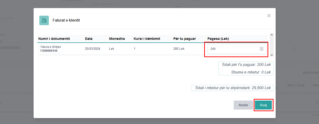 Duke klikuar në butonin paguaj faturat do mund të shihni të gjithë faturat e papaguara nga klienti dhe të paguani ato brenda vlerës së mandatit që do të regjistroni. Për të paguar faturat mjaftonë të përzgjidhni faturat që do të paguani të plotësoni vlerën në fushën Pagesa dhe të klikoni në butonin Ruaj (fig 1.3).