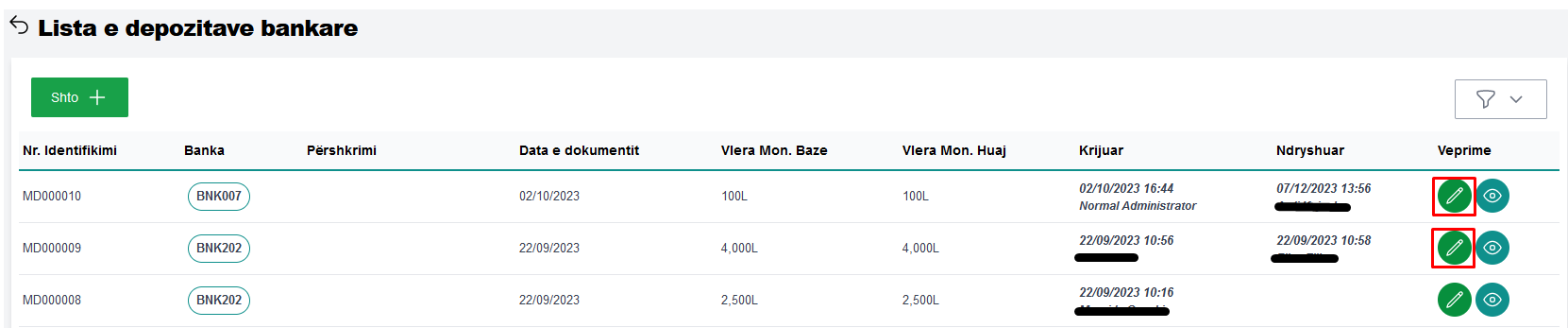 Për të edituar të dhënat e një mandat depozitimi, përzgjidhni mandat depozitimin që do të modifikoni dhe më pas klikoni në butonin Edit, modifikoni të dhënat që doni të ndryshoni, për të ruajtur ndryshimet klikoni butonin Posto (fig 2.1)