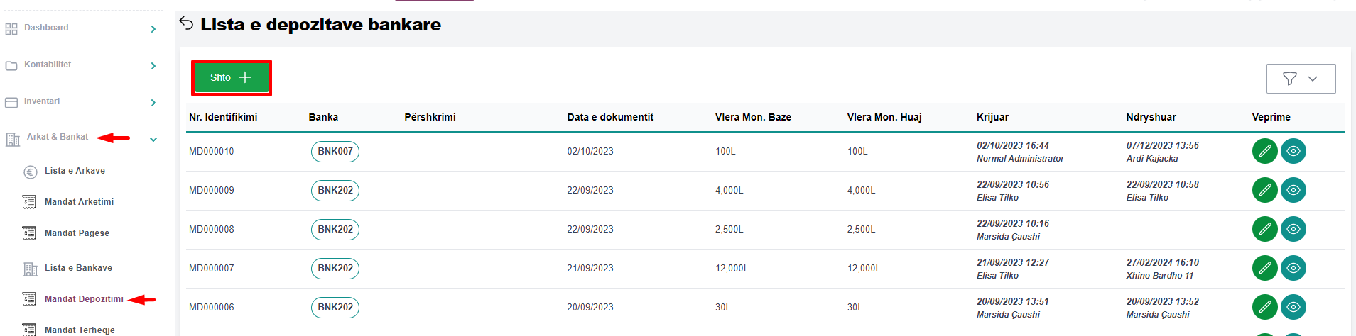 Për të shtuar mandat depozitimi klikoni në menunë Arkat & Bankat, përzgjidhni nënmenunë Mandat Depozitimi dhe më pas klikoni butonin Shto (fig 1.1).