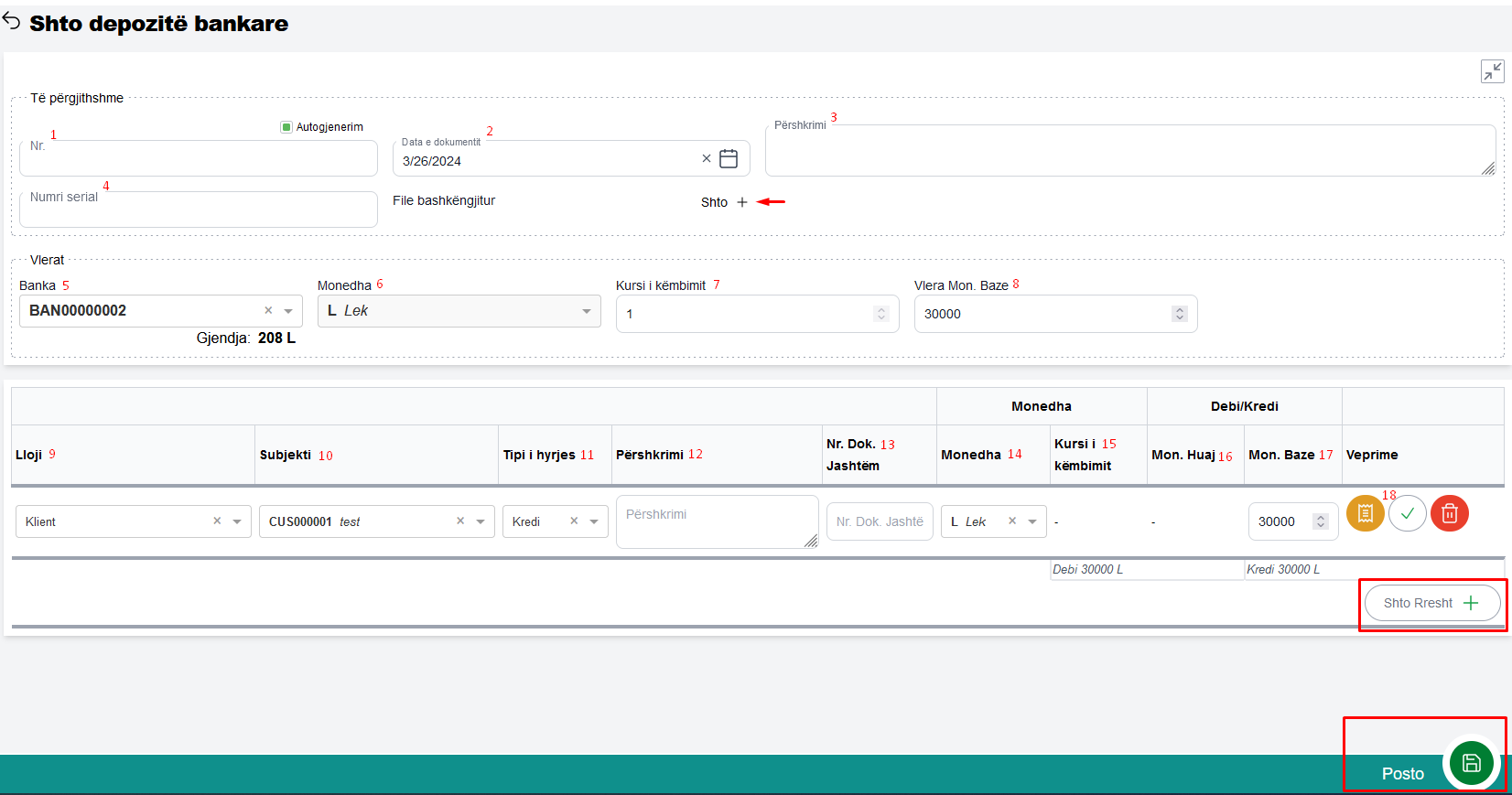 Pasi të keni klikuar butonin Shto, plotësoni të gjitha fushat e nevojshme data dokumentit, pershkrimi, numri serial, banka, monedha, vlera mon.baze, lloji, subjekti,tipi i hyrjes, përshkrimi, mon.baze klikoni butonin Posto (fig 1.2)