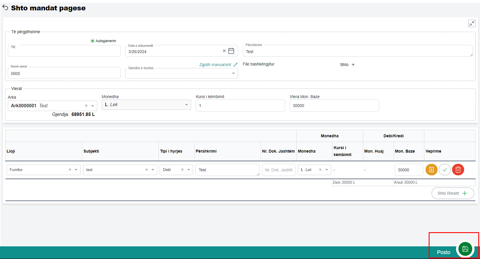 Në dritaren e shfaqur plotësoni të gjitha fushat e nevojshme dhe klikoni butonin Posto për të ruajtur mandat pagesën e krijuar (fig 1.2).