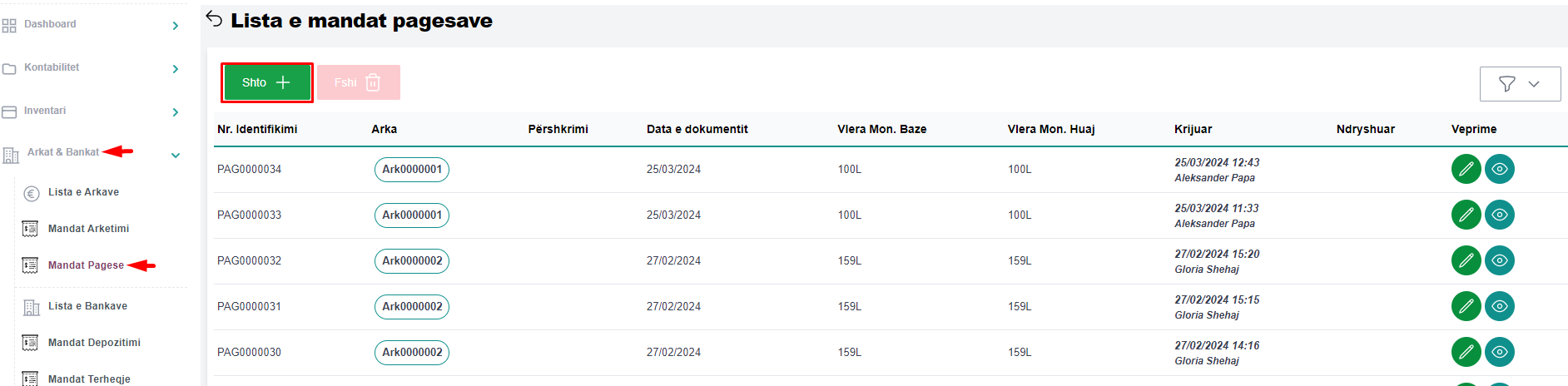 Në menunë mandat pagese do mund të shtoni mandat pagesa, të editoni të dhënat për mandat pagesat e regjistruara në sistem dhe të shikoni detajet për cdo mandat pagese të postuar.