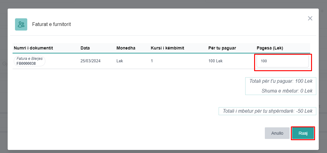 Në rastet kur furnitori ka fatura të papaguara klikoni butonin Paguaj Fatura, përzgjidhni faturën që do të paguani dhe plotesoni vlerën e pagesës për faturë dhe më pas klikoni butoni Ruaj (fig 1.3)