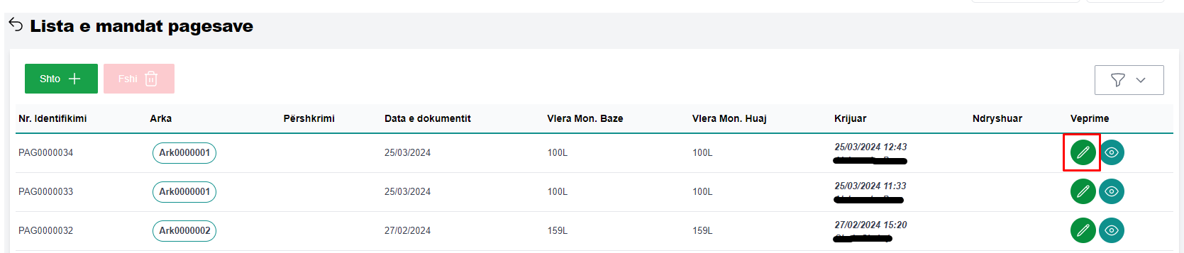 Për të edituar një mandat pagese, përzgjidhni mandat pagesën të dhënat e të cilës do të editoni, me pas klikoni në butonin Ndrysho (fig 2.1).