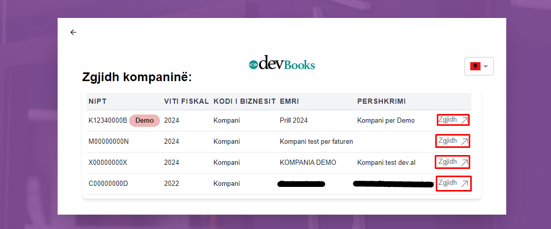 Logohuni në llogarinë tuaj të gmail-it, dhe më pas përzgjidhni kontratën nëse keni të konfiguruar më shumë se një kontratë duke klikuar butonin Zgjidh. Pasi të keni zgjedhur kontratën do mund të zgjidhni kompaninë ku do të kryeni veprime (fig 4).