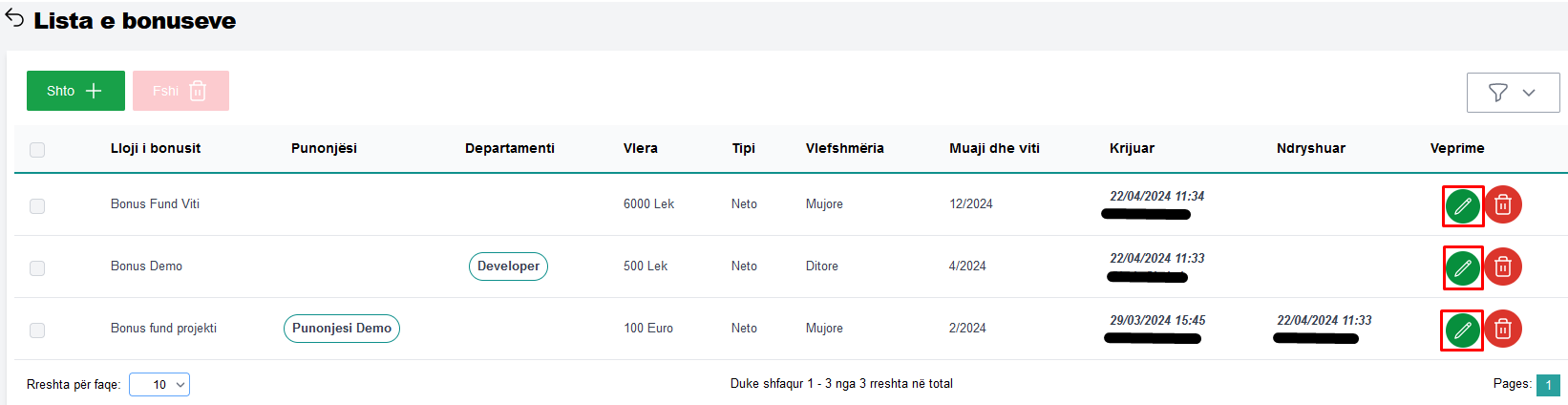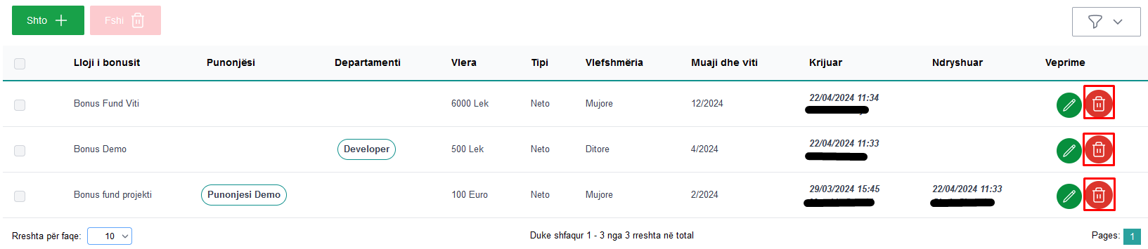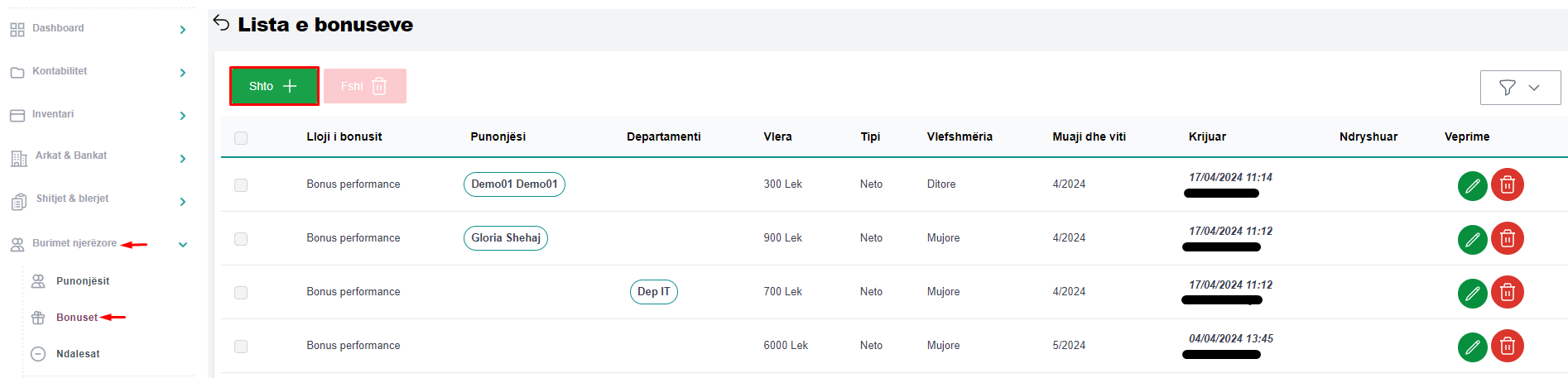 Në menunë bonuset mund të shtoni bonuse, të editoni të dhënat e bonuseve të regjistruara dhe te fshini bonuset.