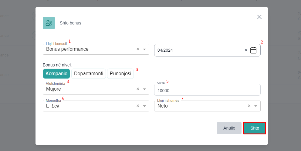 - Bonus në nivel (3) - ekzistojnë tre nivele kompanie, departamenti, punonjësi, përzgjidhni një nga nivelet.