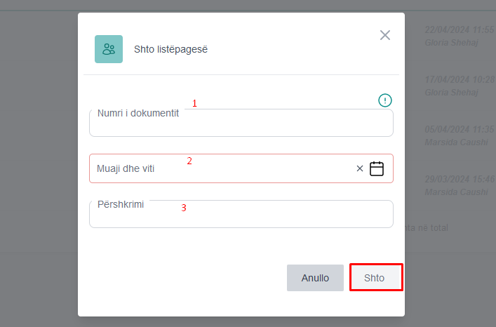 Pasi të keni klikuar butonin Shto, plotësoni formën e hapur dhe klikoni butonin Shto për të ruajtur të dhënat (fig 1.2).