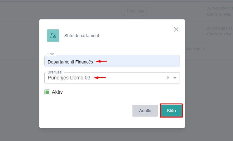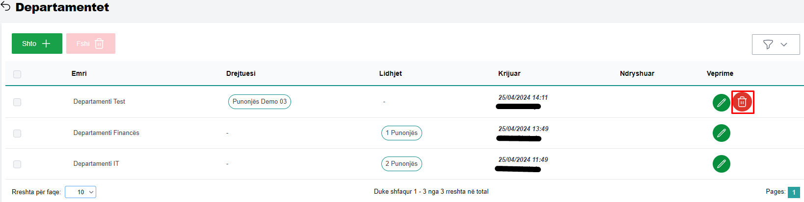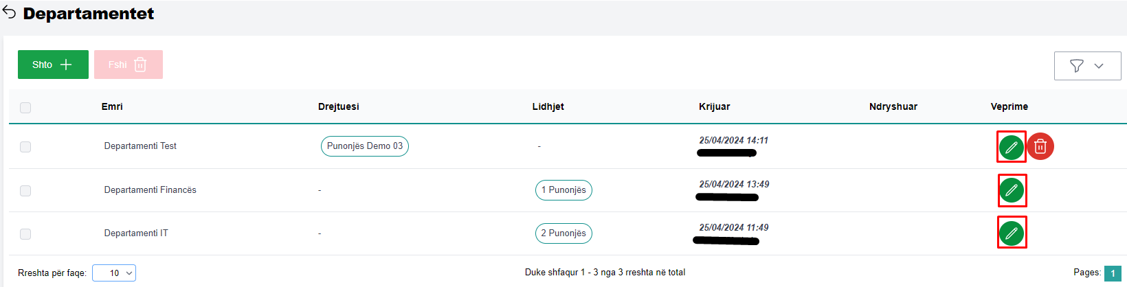 Në menunë departamente do mund të konfiguroni departamentet, të editoni të dhënat e tyre dhe të fshini departamentet.