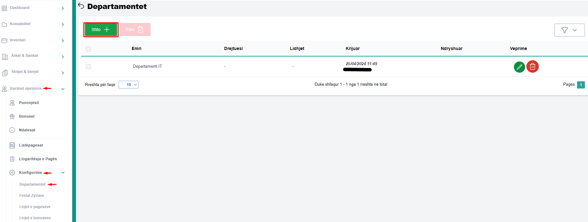 Për të shtuar departamente në sistem klikoni menunë Burimet njerëzore, klikoni nënmenunë Konfigurime, përzgjidhni dhe klikoni nënmenunë Departamente dhe më pas klikoni butonin Shto (fig x).