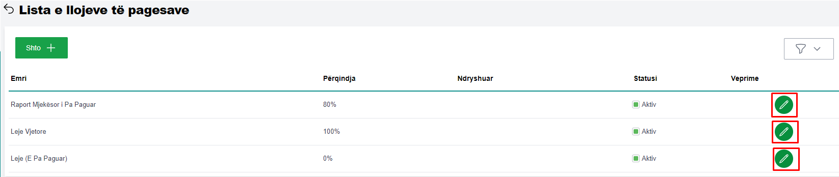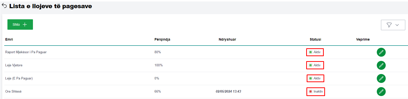 Në menunë llojet e pagesave mund te konfiguroni llojet e ndryshme të pagesave, të editoni të dhënat dhe të ndryshoni statuset për llojet e pagesave të regjistruara në sistem.