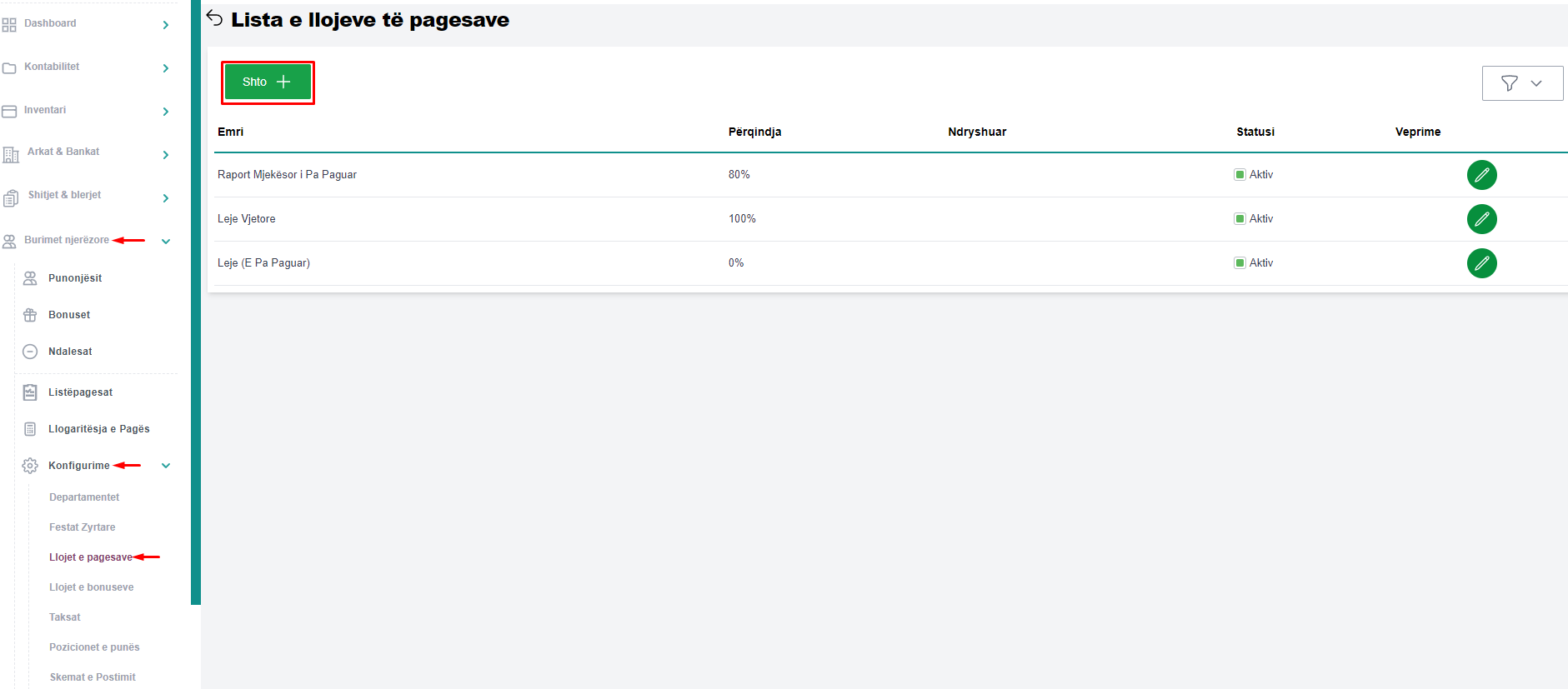 Për të shtuar një lloj pagese në sistem klikoni menunë Burimet njerëzore, klikoni nënmenunë Konfigurime, përzgjidhni dhe klikoni nënmenunë Llojet e pagesave dhe më pas klikoni butonin Shto (fig x).