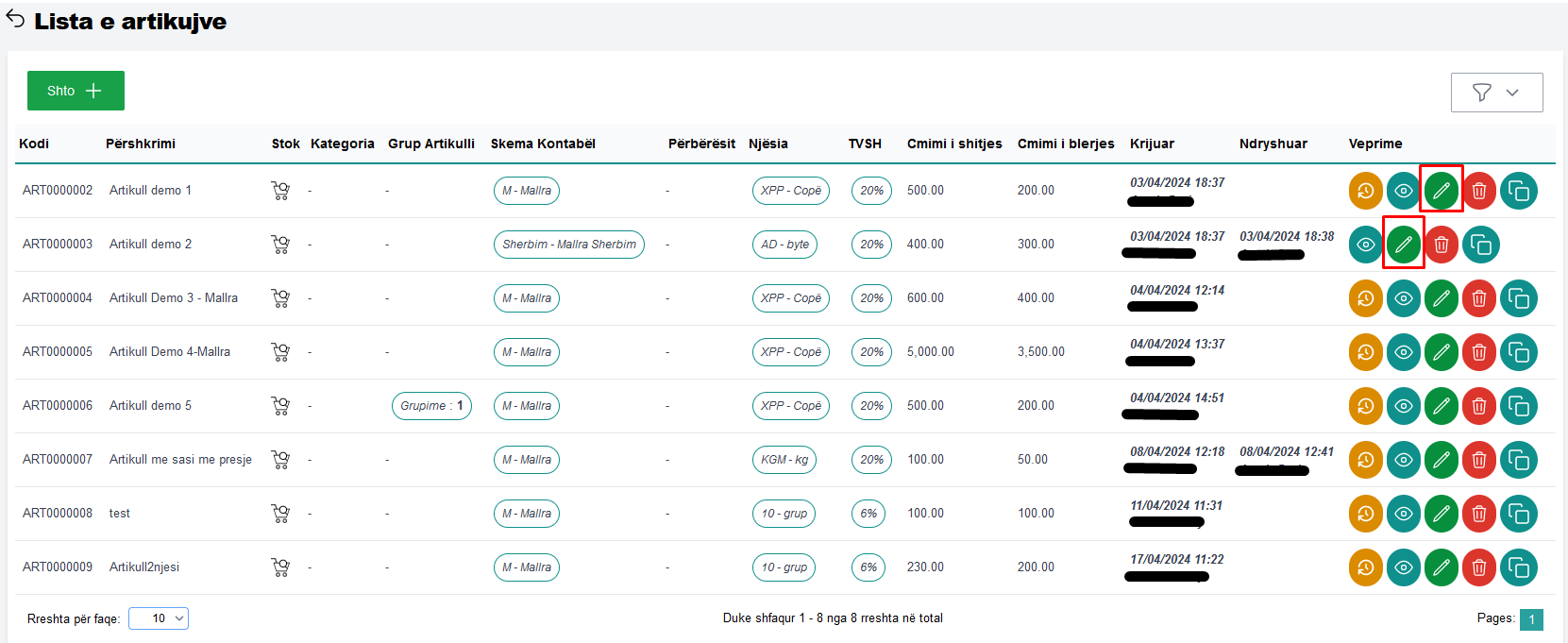 Për të edituar të dhënat e një aritikulli, përzgjidhni artikullin dhe më pas klikoni butonin Ndrysho artikullin (fig 134)