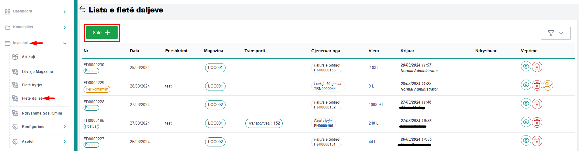 Për të regjistruar një fletë dalje klikoni menunë Inventari, përzgjidhni dhe klikoni nënmenunë Fletë hyrjet më pas klikoni butonin Shto (fig 145)