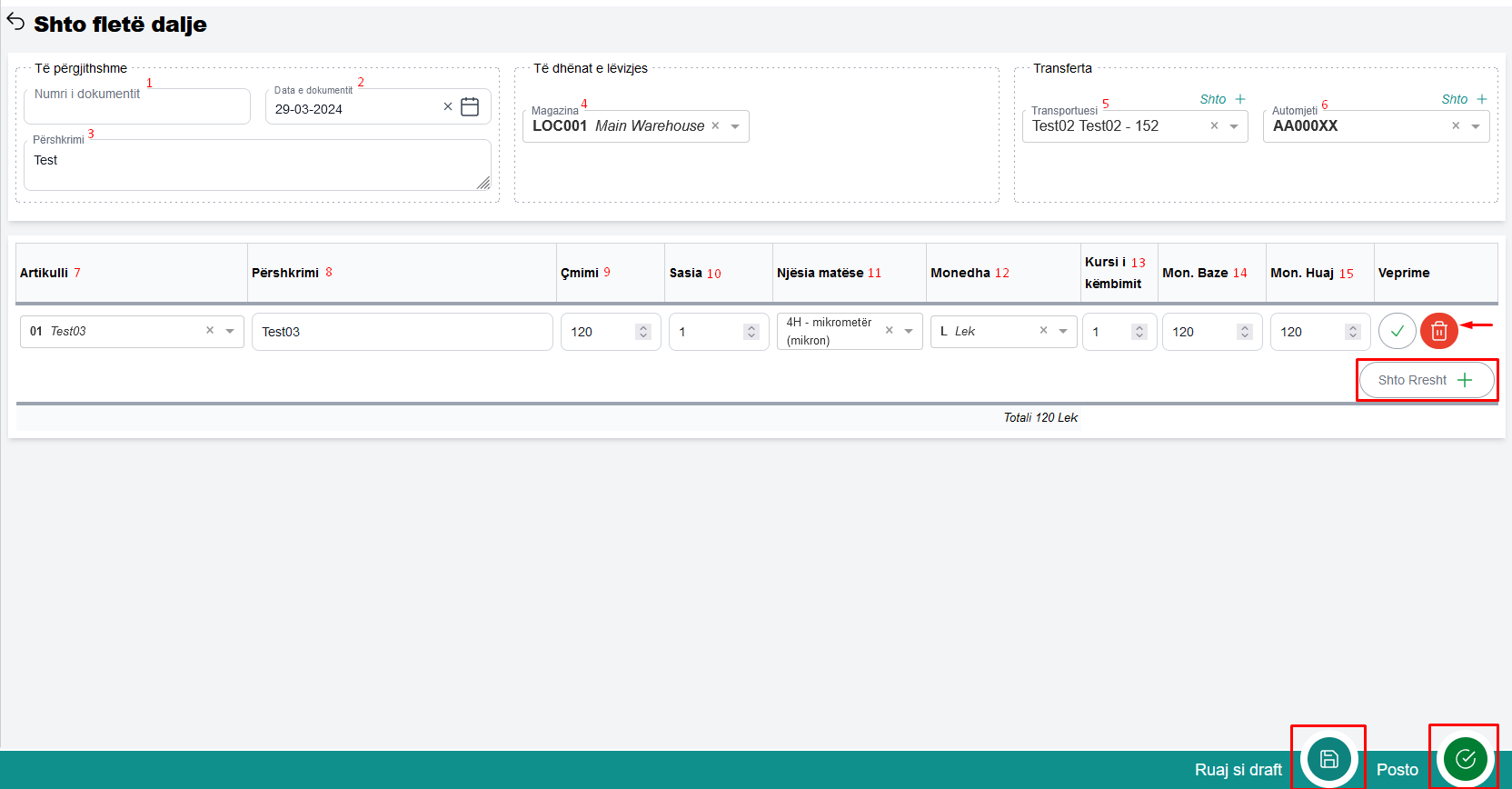 - Shto rresht - për të regjistruar artikuj të tjerë mjaftonë të klikoni butonin Shto rresht.
