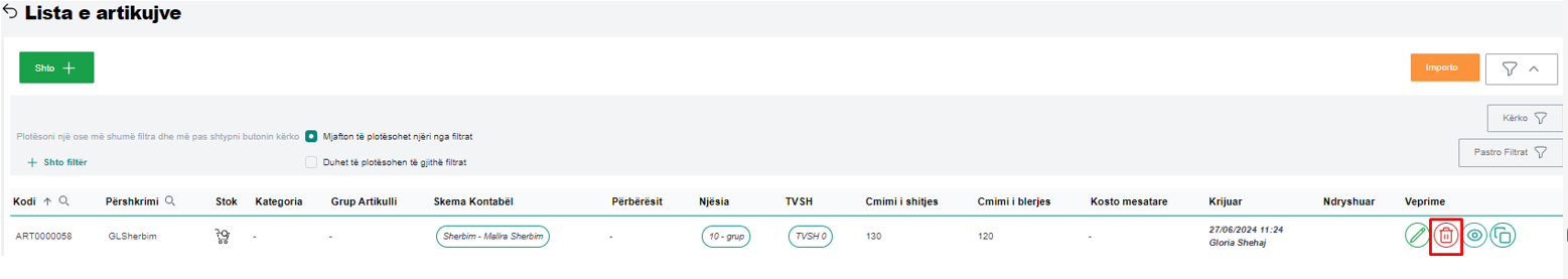 Për te fshirë një artikull nga sistemi mjafton të përzgjidhni artikullin që doni të fshini dhe te klikoni në butonin Fshi (fig 137). Per artikujt te cilet kane veprime te kryera nuk mund te kryhet fshirja.