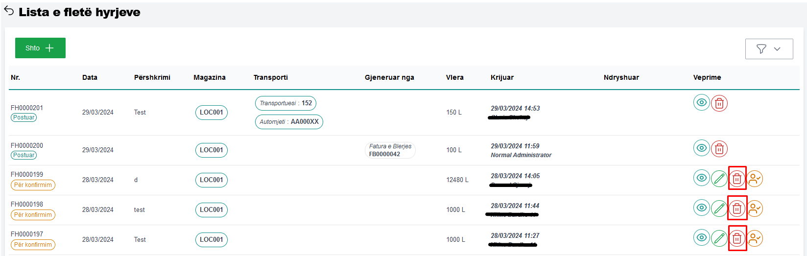 Ju mund të fshini fletë hyrje qe ndodhen në statusin Draft dhe nëse jeni përgjegjës për të administruar fletë hyrjen e regjistruar në sistem.