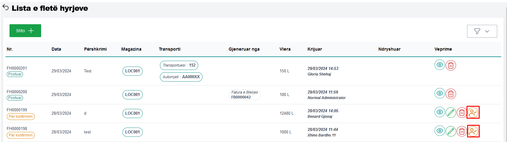 Fletë hyrje në statusin për konfirmim mund të editohen, fshihen dhe konfirmohen vetëm nga përgjegjësi!