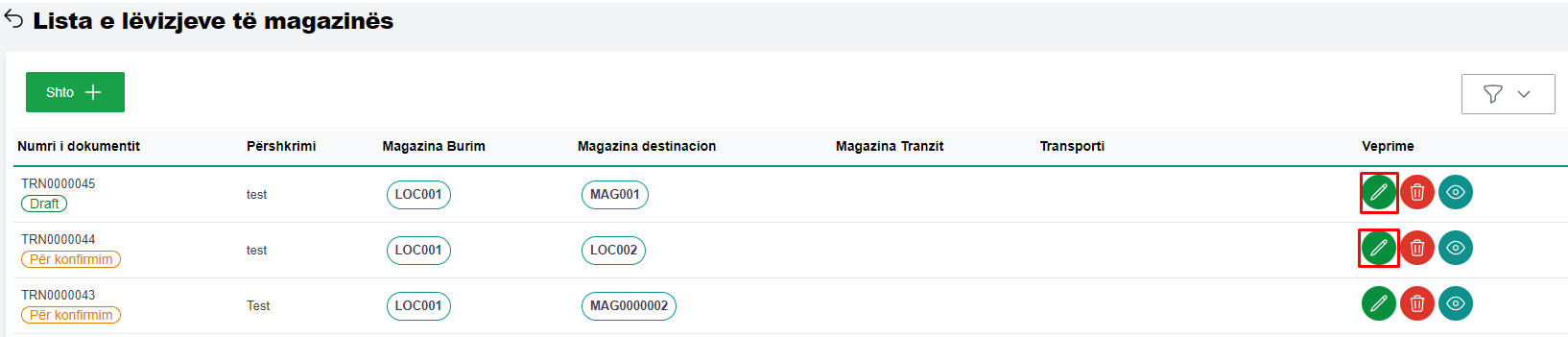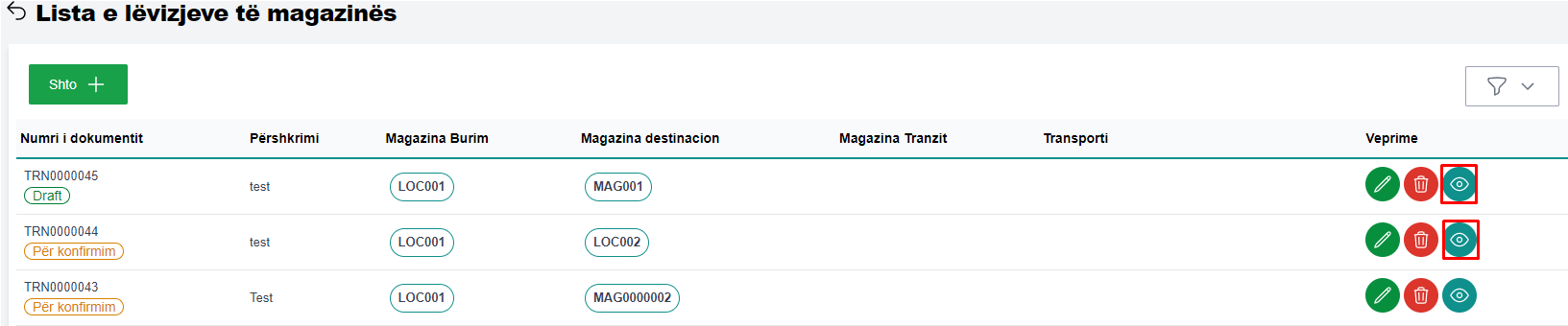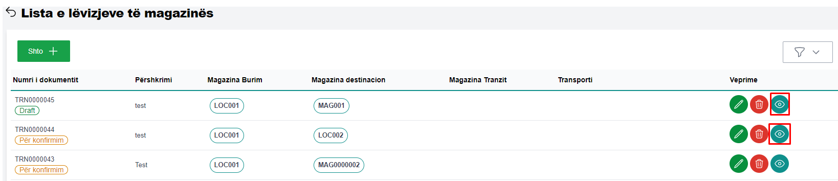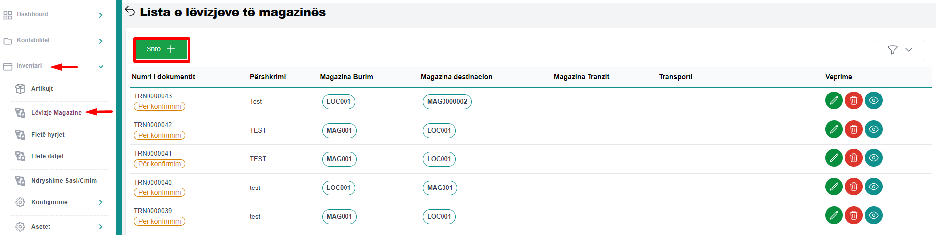 Në menunë levizje magazine do mund të regjistroni lëvizje të artikujve nga një magazinë burim drejt një magazine destinacion, të editoni të dhënat e një levizje magazine të regjistruar në sistem, të shikoni detajet e një lëvizje magazine të regjistruar dhe të fshini.
