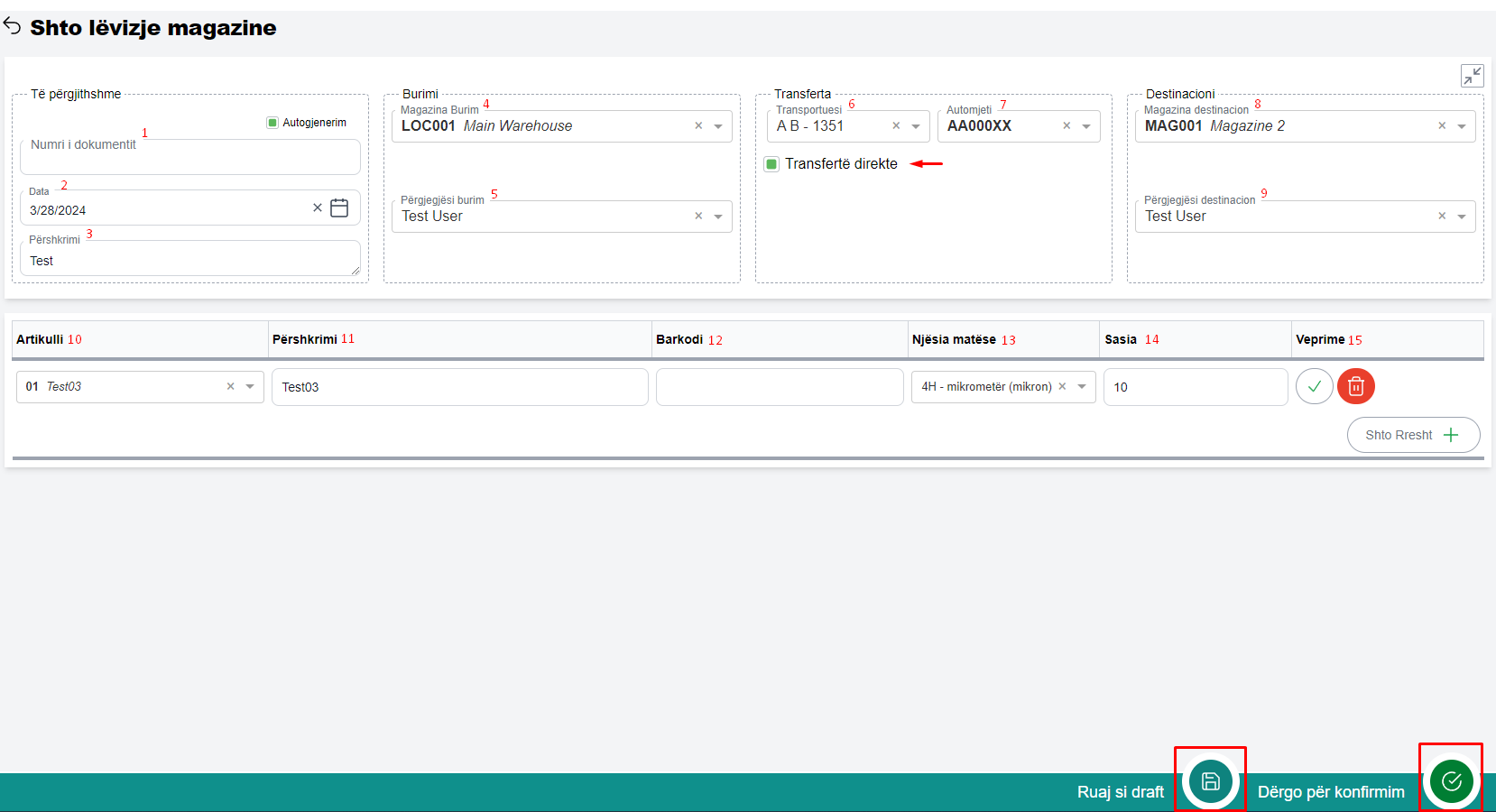 - Numri i dokumentit (1) - numri i dokumentit plotësohet automatikisht në regjistrimin e një lëvizje magazine, në rastet kur dëshironi të plotësoni manualisht numrin e dokumentit mjaftonë të çaktivizoni autogjenerimin