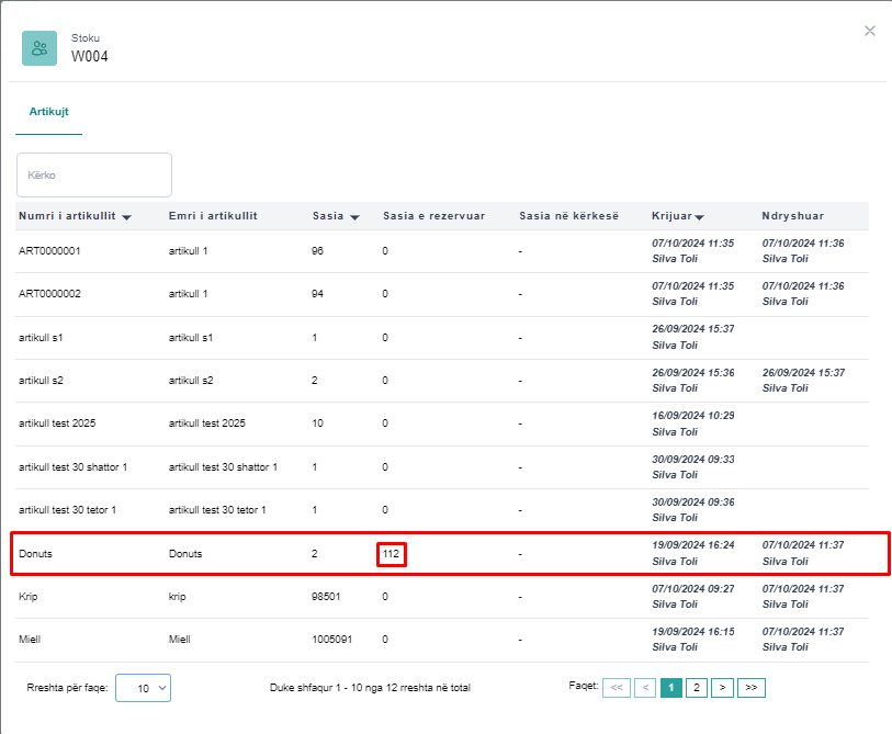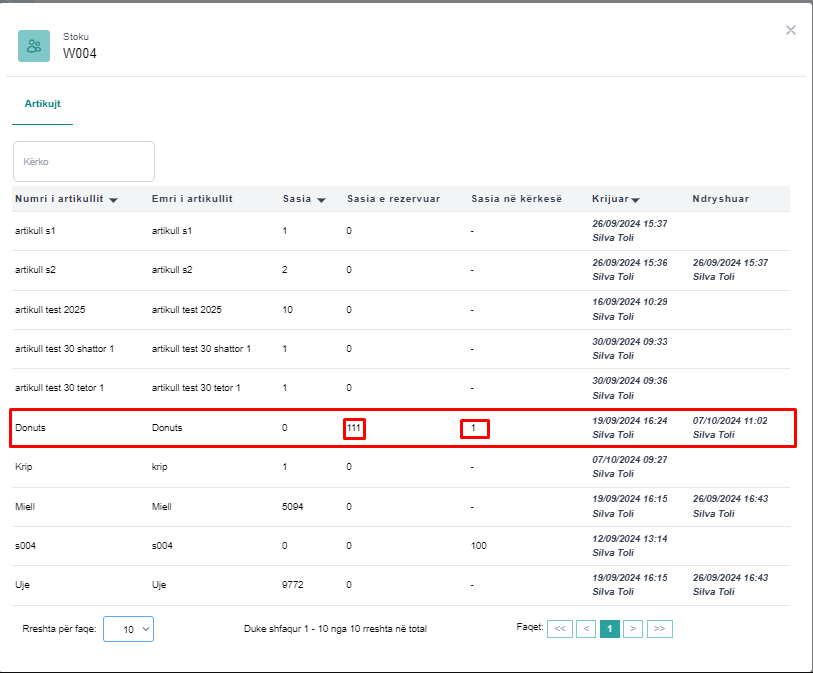 Bazuar në stokun e magazinës W004, 110 njësi janë kaluar automatikisht në statusin "rezervuar", ndërsa 1 njësi është vendosur në "kërkesë" pasi tejkalon gjendjen aktuale prej 110 njësish.