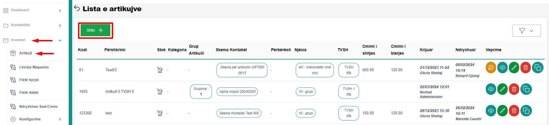 Për të shtuar një artikull të ri klikoni në menunë inventari, përzgjidhni dhe klikoni nën menunë Artikujt. Do t'ju shfaqet lista e artikujve të regjistruar në sistem, më pas klikoni butonin Shto (fig 129)