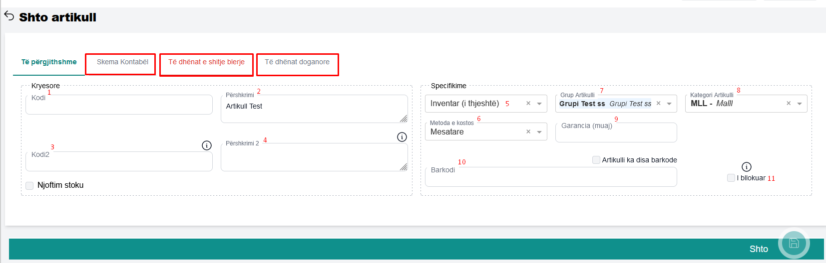 - Kategori artikulli (8) - në fushën kategori artikulli shfaqen të gjitha kategoritë e konfiguruara në menunë "Kategoritë e artikujve".