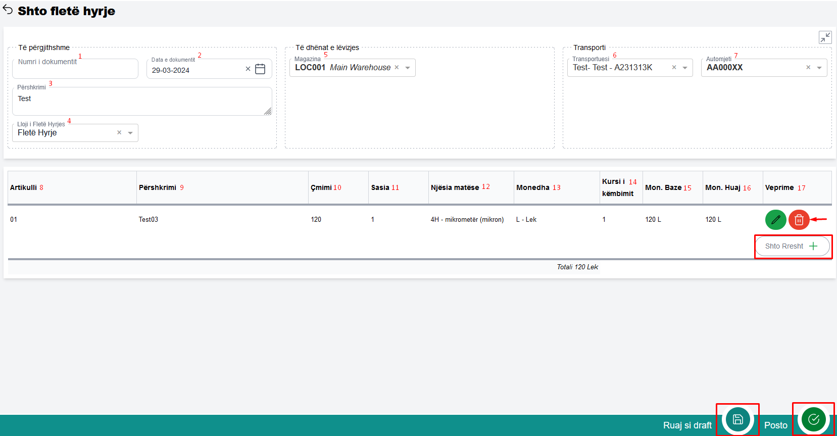 - Posto - klikoni butonin Posto për të regjistruar dokumentin në sistem , pas postimit dokumenti nuk mund te editohet.