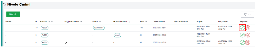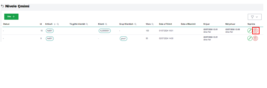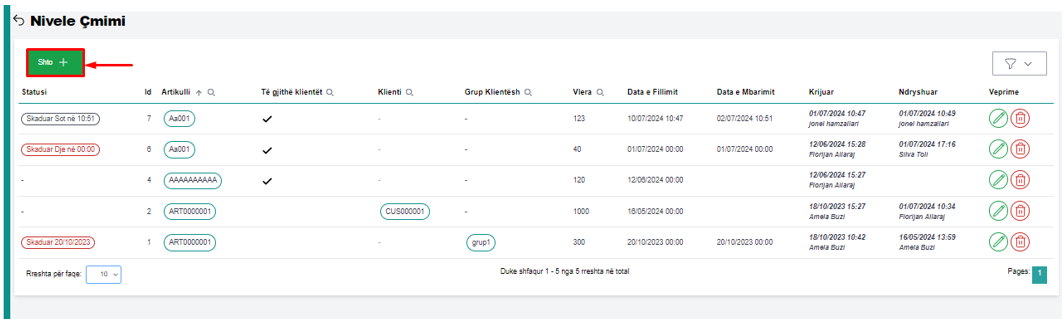 Në ekran do t’ju shfaqet lista me të gjithe nivelet e cmimeve te shtuar në sistem. Për të shtuar një nivel cmimi te ri klikoni në butonin Shto.