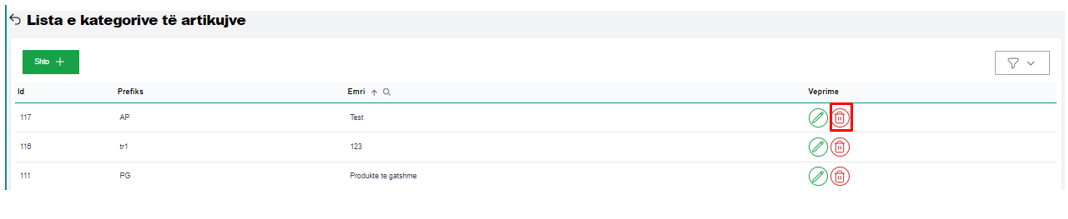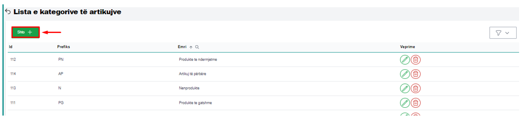 Në ekran do t’ju shfaqet lista me të gjithe kategorite e artikujve te shtuar në sistem. Për të shtuar një kategori artikulli te ri klikoni në butonin Shto.