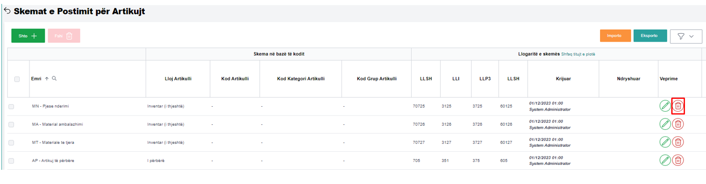 Për te fshirë një skeme postimi nga sistemi mjafton të përzgjidhni skemen e postimit që doni të fshini dhe te klikoni në butonin Fshi (fig 99).