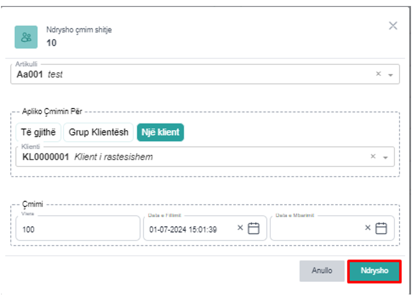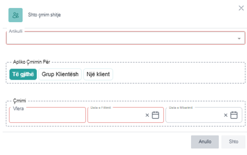 - Apliko Cmim Për : Përzgjidhet 1 nga 3 grupet se në cfarë niveli do e aplikosh cmimin e shitjes për të gjithë klientët për një grup klientësh apo vetëm për 1 klient.