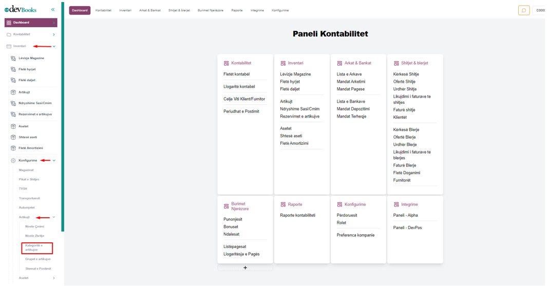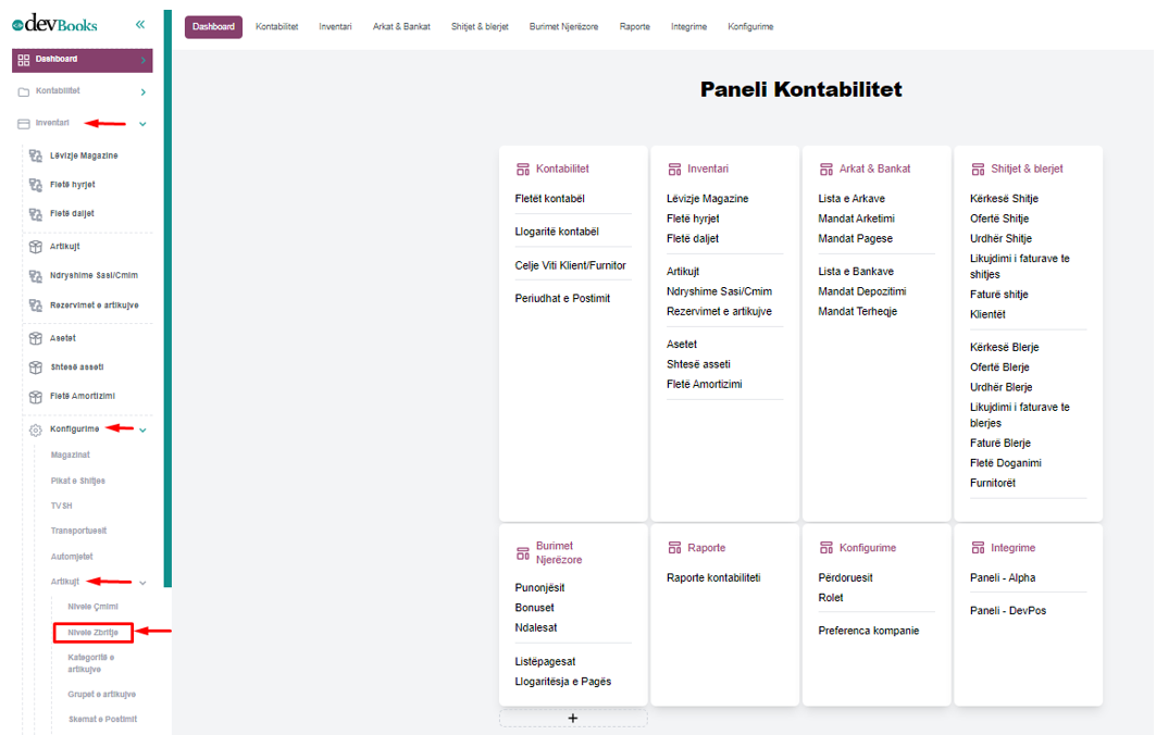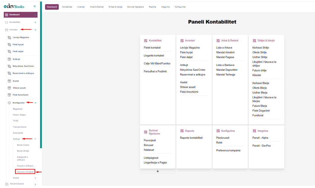 Nënmenunë e artikujve, do të shihni opsione të ndryshme si "Nivelet e Çmimit", "Nivelet e Zbritjes", "Kategoritë e Artikujve", "Grupet e Artikujve" dhe "Skemat e Postimit". Këto opsione ofrojnë konfigurime të veçanta për menaxhimin e artikujve të cilët celen fillimisht tek seksioni Artikujt.
